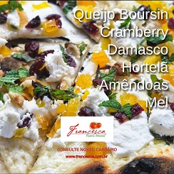 pizza Sobre a mozarela de búfala, queijo de cabra tipo boursin cremoso, cranberries, damascos, hortelã fresco e amêndoas fatiadinhas. Finalizamos com mel